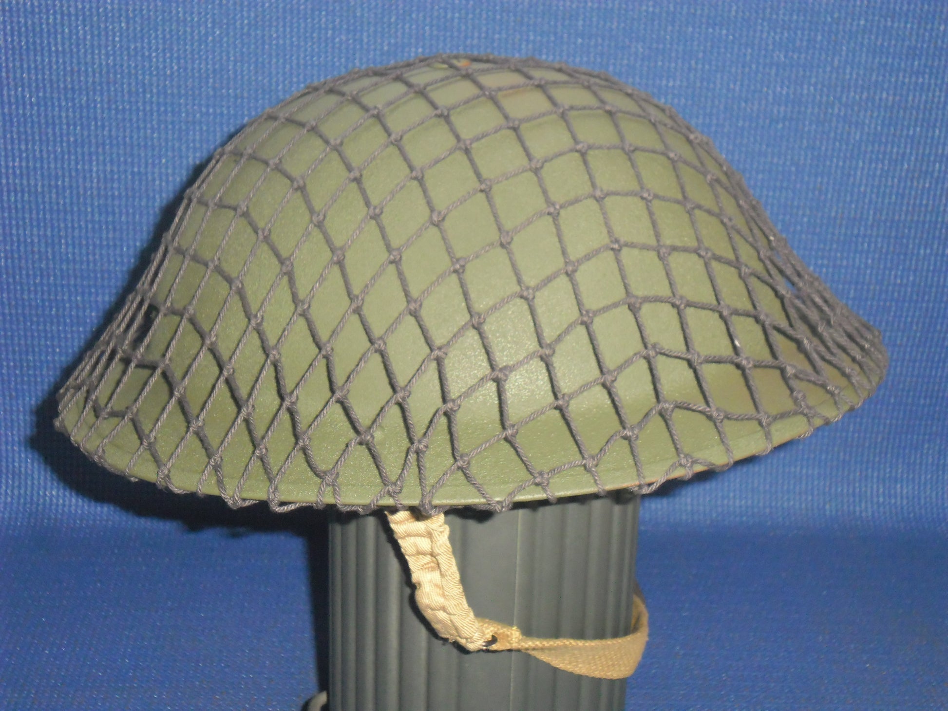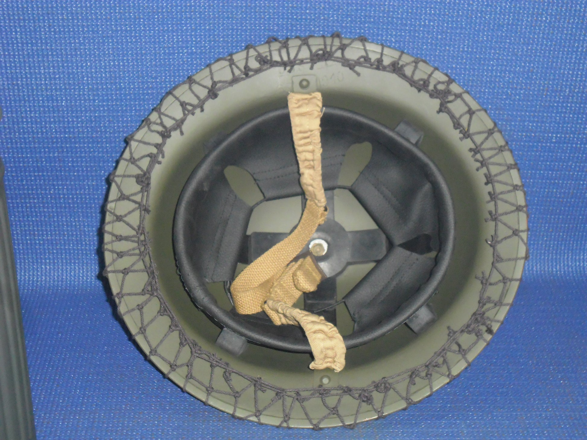Brit40 - The shell is an original WW2, British manufactured MkII shell with a stainless-steel banded edge. The stainless-steel chinstrap lugs are the MkIII type and are not marked. The factory stamps under the flare, near one of the chinstrap lugs, are JSS 67 I/1940 (Joseph Sankey & Sons Ltd, Bilston, Eng.). When acquired the shell outer had flaking grey paint; the inner had flaking grey paint under the flare and tan paint in the dome. The shell cleaned up nicely; it was stripped to bare metal, primed then painted in olive-drab with a textured outer. The helmet liner is an imported replacement from SOF in Wales, it is an early war Mk II type liner with an oval shaped bumper pad and felt spacers. It is a head size 58cm with a recycled brass top-bolt and nut. The helmet has been fitted with a replacement spring/web type, khaki chinstrap with steel hardware. This helmet has the tactical flash for the 1st Independent Guards Brigade painted on the left side; a red stripe on blue with a white number one. An olive-drab cam net has been fitted.