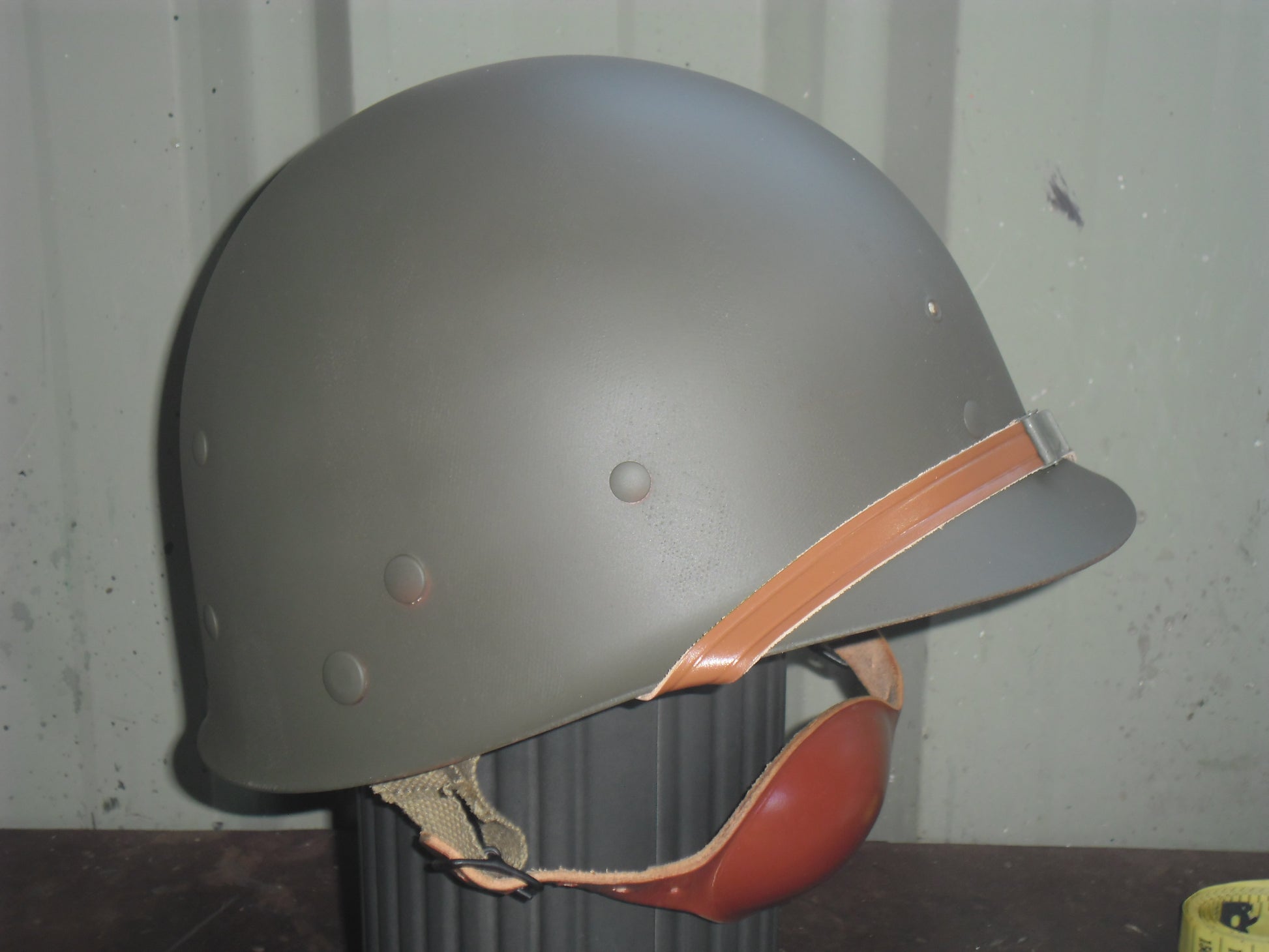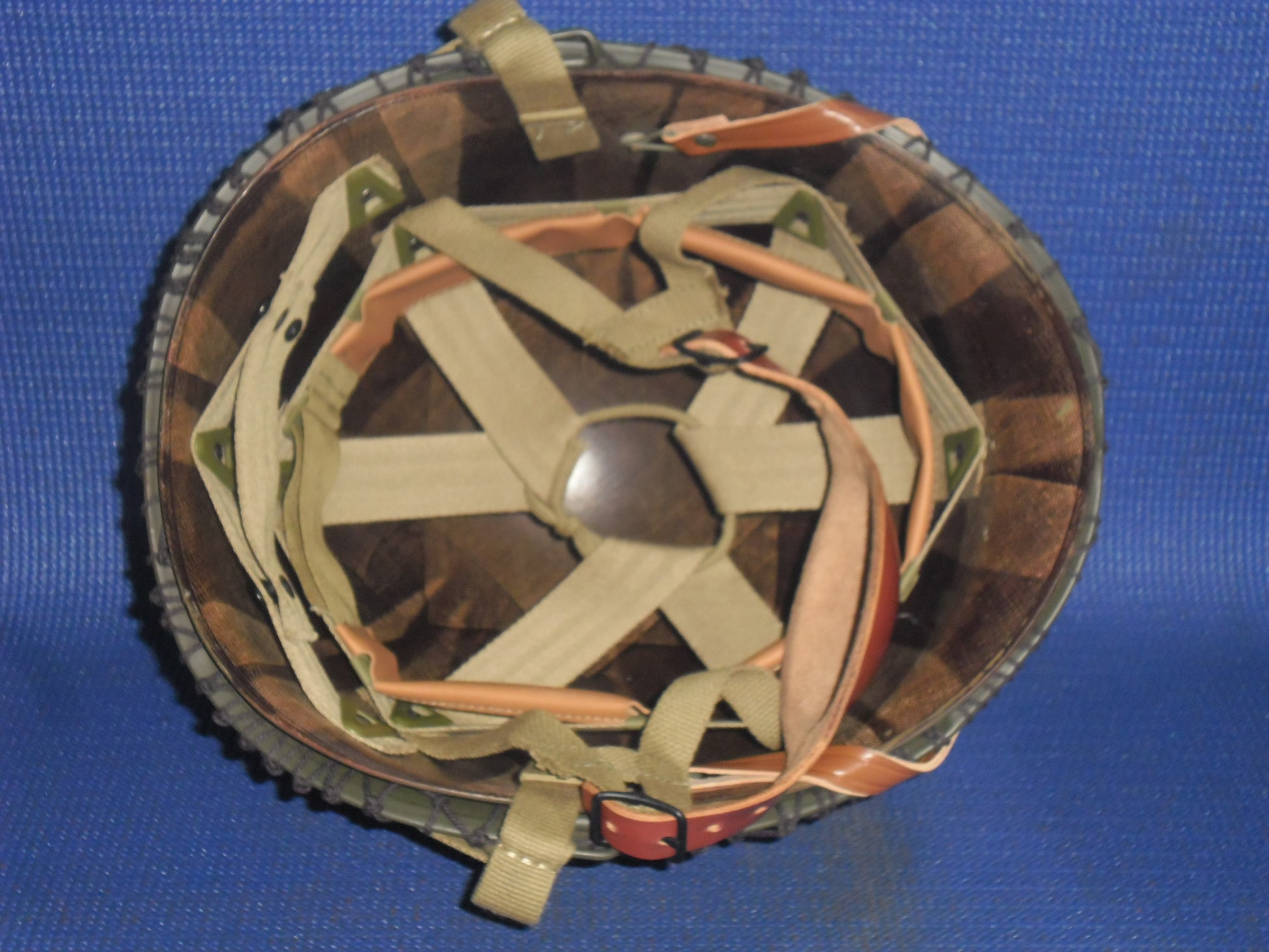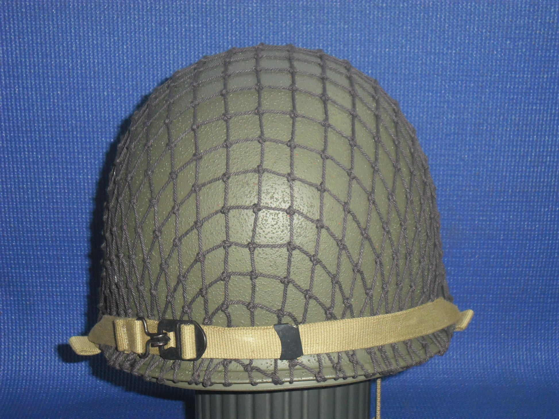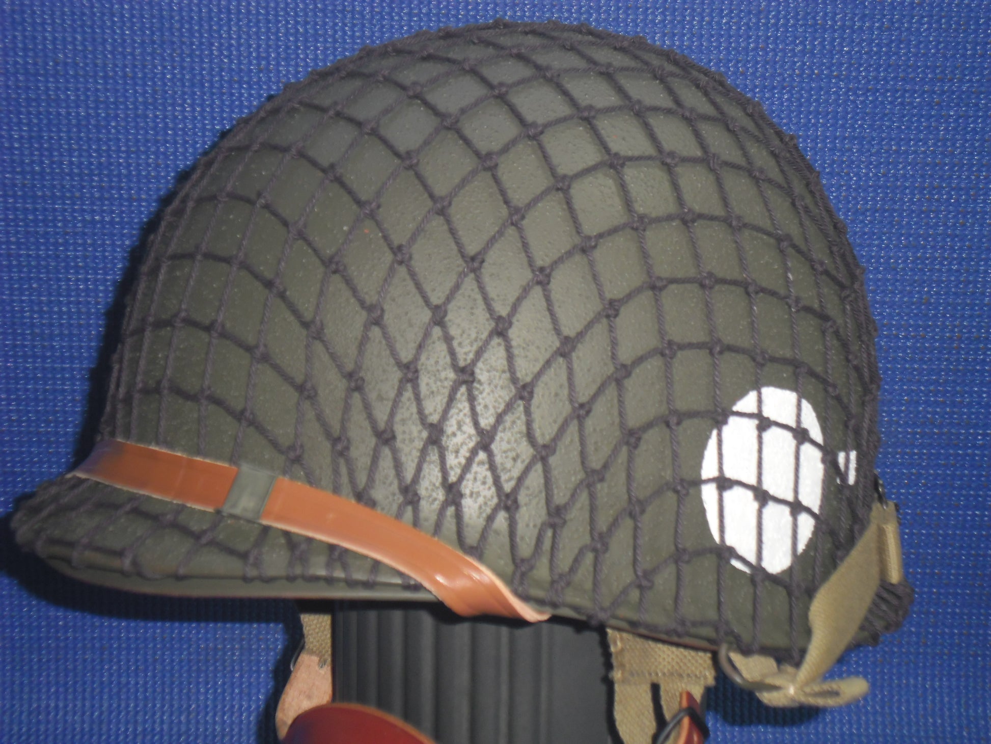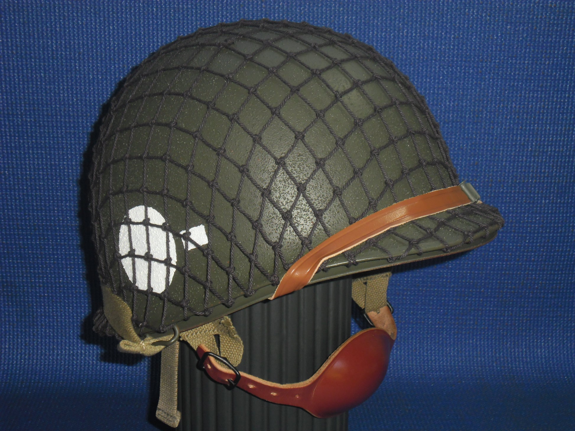 US FS #85 - The shell is an original WWII McCord Radiator with a front seam, stainless-steel band and swivel bales. The heat stamp is 927M (never seen an M before). When acquired, the shell was hand painted in a post-war green. There is no rust. The shell was stripped to bare metal, primed and painted olive-drab with a textured outer. A new OD3 para chinstrap set has been fitted. The liner is an original of WW2 vintage, it is a high-pressure type manufactured by Westinghouse. The Westinghouse logo and the mould number D8 (the D is backwards) can be found in the crown. When acquired, the liner was painted in many layers; olive-drab, black, white and olive-drab on top. The original OD3 webbing was present in poor condition with a couple of rips. The liner shell was totally stripped externally and has been repainted in olive-drab. The inside has been fully refurbished with brand new triple-weave OD3 webbing, new A washers and rivets, new sweatband, new brown leather chinstrap, new para ‘A’ straps, new neck strap, new para female snaps and new leather para chin cup. The helmet has the D-Day tactical flashes for the 321st Glider Field Artillery Battalion; an element of the 101st Airborne Division. A dark olive-drab cam net has been fitted.